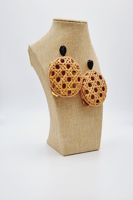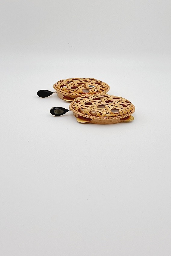 Pendientes de Jade con Panderetas artesanas, confeccionados con Paja De Viena o conocida también con el nombre de Rejilla. Un material que se ha convertido en Icono gracias a las clásicas sillas de mediados de siglo XIX.