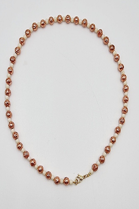Gargantilla de bolitas de Lava bañadas en Oro Rosa y bola de pasta de Coral color crudo. Mide 40/42cm. Bola 6mm