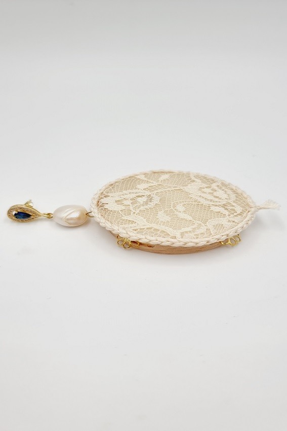 Pendiente Individual de Plata, Circonitas y Perla Irregular con nuestra Pandereta Artesana. Forrada de Encaje en color Crudo, evocando Romance y Feminidad.