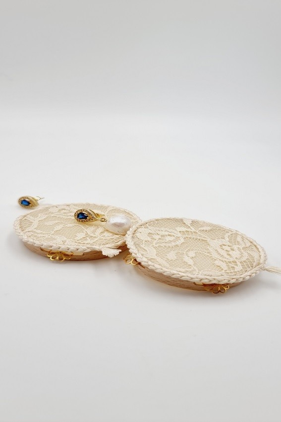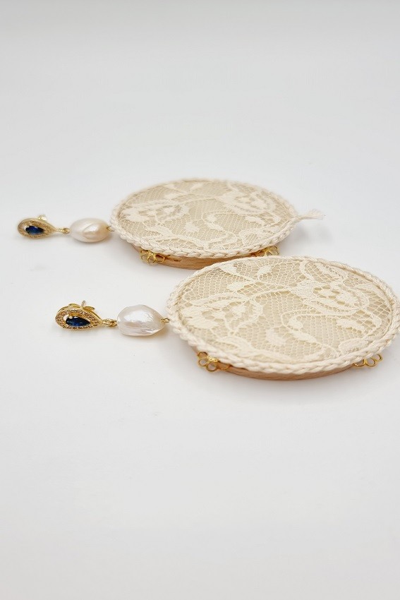 Pendientes de Plata, Circonitas y Perla Irregular con nuestra Pandereta Artesana. Forrada de Encaje en color Crudo, evocando Romance y Feminidad.