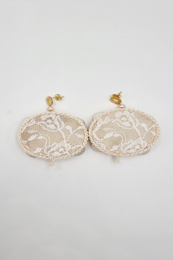 Pendientes de Plata y Perlita, con nuestra Pandereta Artesana. Forrada de Encaje en color Blanco , evocando Romance y Feminidad.