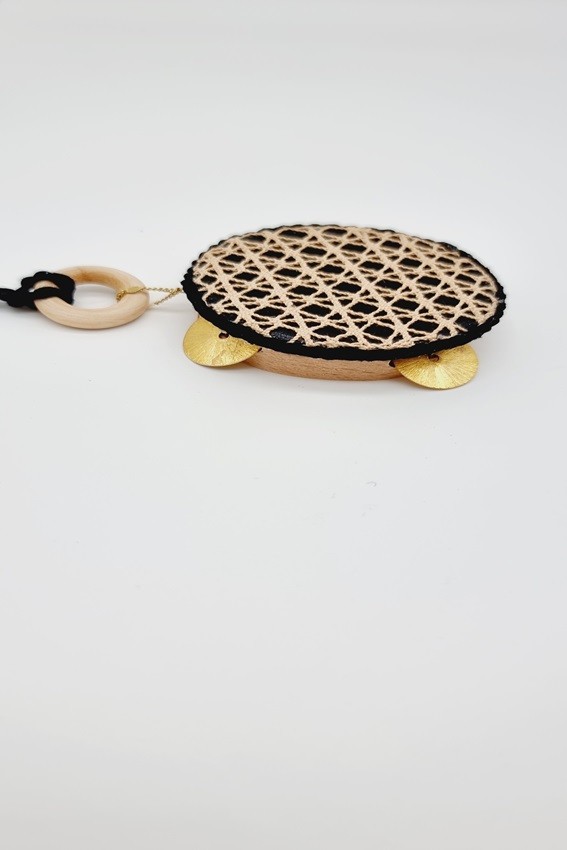 Pandereta Artesana con Encaje de Bolillos y sonajas de Latón chapadas en Plata.