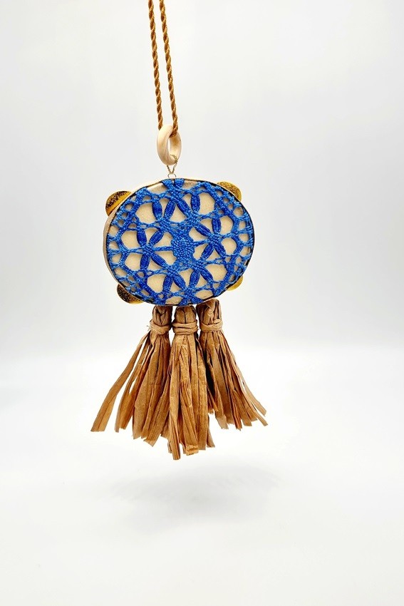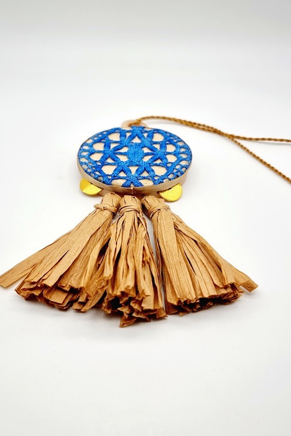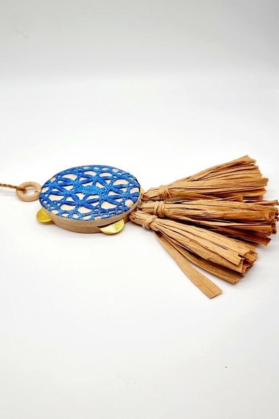 Pandereta Artesana, de Madera de Haya y Piel de Cabra. Está revestida por Bolillo de Algodón Azul y 3 borlas de Rafia Natural. Mide 6,5 cm. Cordón Incluido.